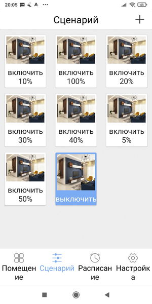 Сценарии (управление сценами) позволяют назначить отдельным светильникам или группам светильников определенные уровни яркости, цветовой температуры, время разгорания света / время затухания света. То есть, назначить определенную сцену, которая формируется путем выполнения заданной последовательности команд. Привязка сценария для его включения, выполняется к физической кнопке (выбранной кнопке сценарного выключателя) и/или к виртуальной кнопке (назначенной иконке в смартфоне или планшете). Так как сценарии выполняется локально, без всякого облака, то нет никаких задержек при выполнении сценариев, нет никакой зависимости от наличия интернета, все равно, есть интернет или он отсутствует. Количество сценариев, для каждого сегмента сети (отдельной шины или линии), как правило, не более 16. Но, так как вся общая сеть состоит из отдельных сегментов (отдельных шин или линий), которые логически стыкуются между собой, то количество сценариев в общей сети практически безгранично. Название сценария задает пользователь. Стандартная фотография для иконки сценария в случае необходимости заменяется на выбранную пользователем.